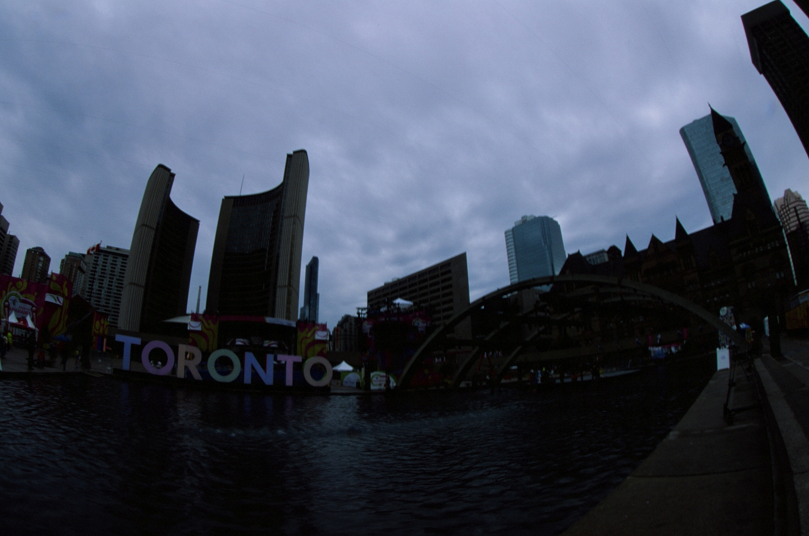 L-R: Rogers Centre, The PanAm Flame, The CN Tower and Ripley’s Aquarium. (Velvia 50, Pentax Fisheye at 17mm, F32, 1/30)