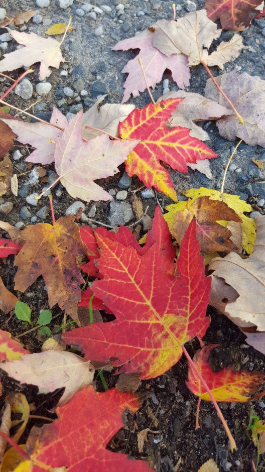 Red and yellow maple leaves found during our walk